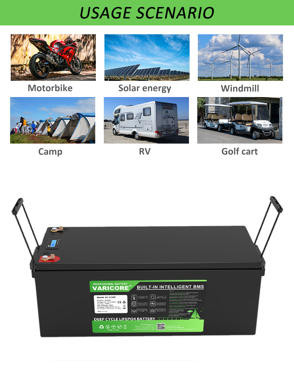 RV, motorcycle, solar energy, electric tower, windmill, camping, electric car, golf cart, etc.